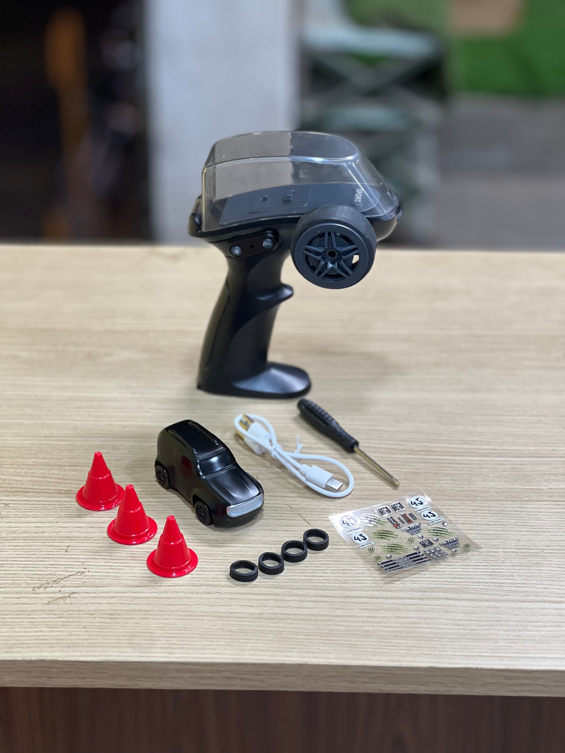 The set includes a pistol-grip style remote controller for easy handling, extra drift tires, mini traffic cones for creating your own racing track, and a USB charging cable for convenient recharging.